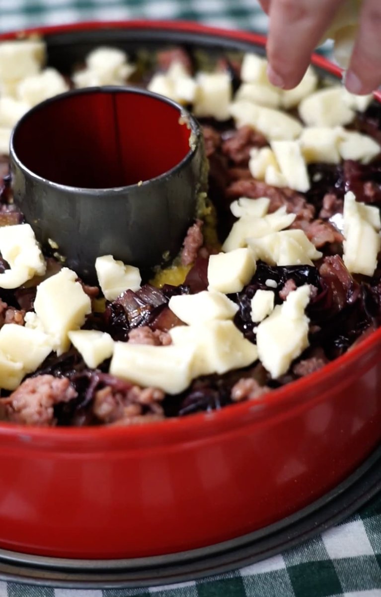 - Ungere lo stampo e versare circa metà della polenta. Aggiungere il radicchio e la salsiccia, quindi distribuire il Castelnero a dadini.